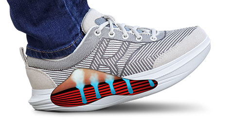 Eine sehr schwache Muskulatur kann anfangs das Gelenk beim Gehen nicht ausreichend stabilisieren. Das kann dazu führen, dass die Reizung im Gelenk erst einmal zunimmt. Das langfristige Tragen des kybun Schuhs verbessert die Propriozeption, Sensomotorik und Muskulatur und führt schnell zu einer Stabilisierung des Fusses und des gesamten Körpers. Die schwache Muskulatur muss sich aber zuerst an die neue Belastung gewöhnen und kann deshalb am Anfang mit Müdigkeit oder sogar Schmerz reagieren. Darum müssen in solchen Fällen Pausen eingehalten und mit den Grundübungen auf der kybun Matte sowie den Spezialübungen im kybun Schuh entgegen gewirkt werden. Für schnelle und kontinuierliche Umwandlung der Muskulatur- und Bewegungsstrukturen empfehlen wir «Intervall Walking» und «Mikro-Intervall am Ort».